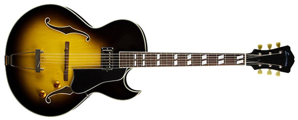 List price: $2,575Old-World craftsmanship creates a new jazz standard. The flagship guitar in the Eastman archtop line, the AR805CE Uptown Archtop features a hand carved solid spruce top, hand carved solid maple back and sides, solid maple neck, an ebony fretboard and compensated bridge, and a gold and ebony trapeze-style tailpiece. The guitar, a classic Venetian cutaway with a single floating Kent Armstrong pickup, is outfitted with Gotoh tuning machines with ebony buttons, and volume and tone controls mounted on the ebony pickguard. Available finishes include classic and sunburst. D’Addario roundwound strings and hardshell case included.