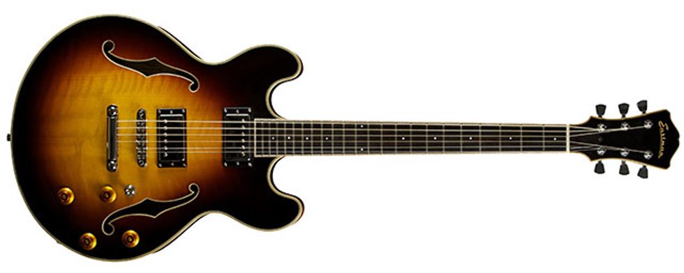 List price: $1,050A great guitar for rock and roll! The versatile T386 Thinline Electric features a full-size 16’’ body with a laminate maple top, back and sides, coupled with dual Kent Armstrong humbucker pickups to produce amazing, responsive tone with very little feedback...but plenty of attitude! Solid maple neck with rosewood fingerboard featuring pearl dot inlays. The double Venetian-style cutaway, dual mounted Kent Armstrong humbucking pickup design is controlled by two volume and two tone knobs with a three-way selector switch. Appointments include ivoroid binding, chrome tuners, fixed chrome tunable Gotoh bridge, and chrome stop tailpiece. The T386 is available in sunburst, red and black. D’Addario XL strings and hardshell case included.