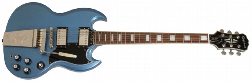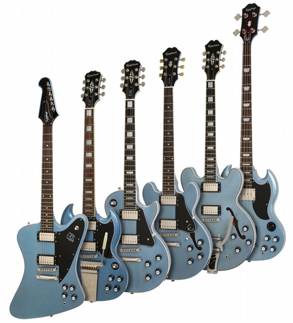 The Ltd. Ed. TV Pelham Blue Collection includes the world famous Les Paul Custom PRO with ProBucker pickups and coil tapping, the SG Custom w/Maestro vibrato and Alnico Classic humbuckers, the historic Epiphone ES-355, the ES-339 PRO with Alnico Classic humbuckers and coil tapping, the Firebird Studio, and the rock and roll favorite EB-3 bass. All six of these Epiphone classics will be issued in limited quantities.