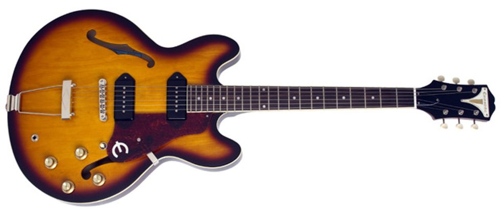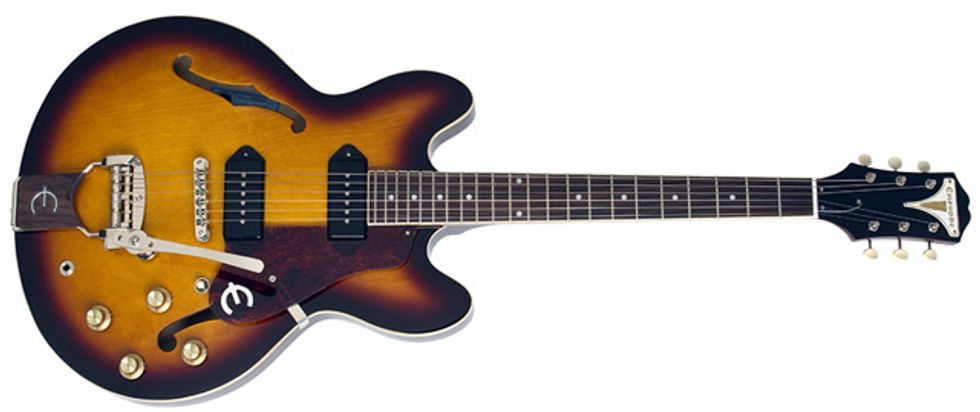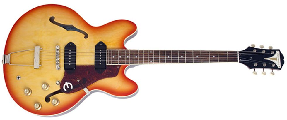 Nashville, TN (June 14, 2011) -- Epiphone is bringing back the first Casino in celebration of it's 50th anniversary - the "1961" Casino. Introduced in 1961, the original Casino had unique features that ultimately were never offered beyond that first year. These include the pre-Gibson era triangle metal logo badge on the headstock, "Dot" fingerboard inlays, a blank two-ply "bullet" truss rod cover, a tortoise-colored pickguard with foil "E", and black dog-ear P-90 pickups. Epiphone has faithfully reproduced these features for a one-of-a-kind retro look not found on Casinos produced after 1961. Other attention to detail includes the correct "burst" patterns on front and back, a neck joint at the 16th fret (instead of the 17th), Wilkinson Vintage-Style tuners with white buttons, and the historically accurate rectangle "blue label" inside the sound hole.
