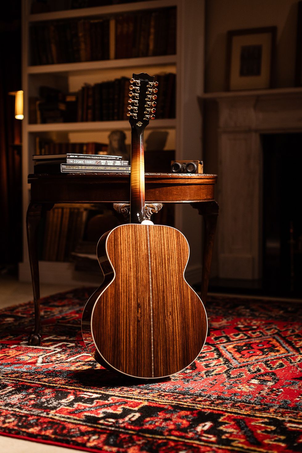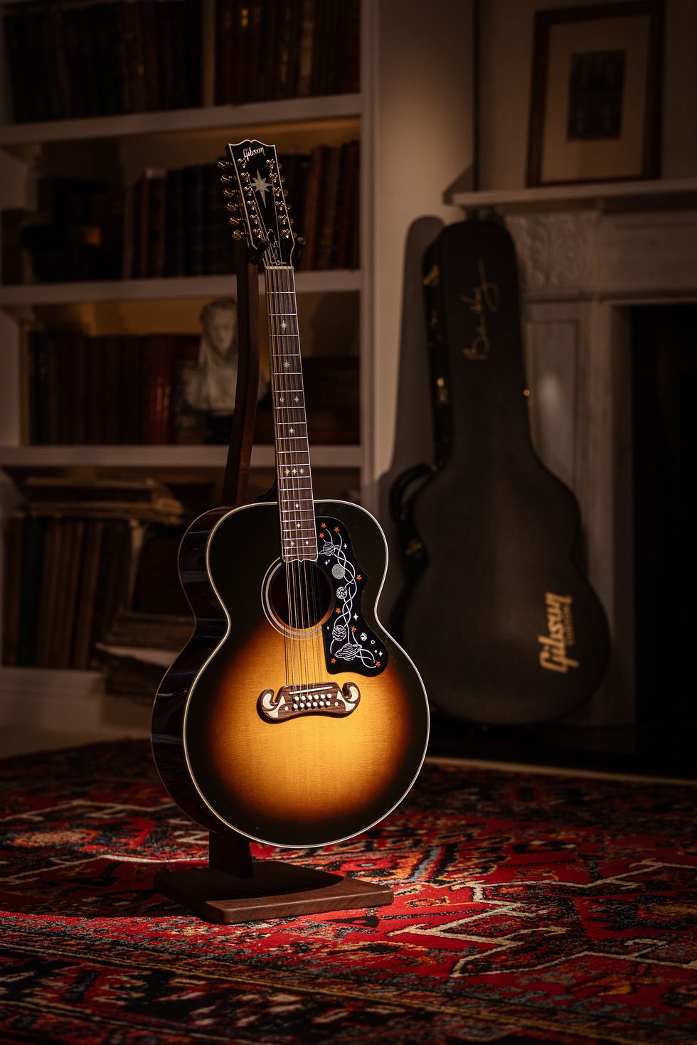 After building one for the guitarist, Gibson created a limited edition run of 100 instruments of the new model, called the Brian May SJ-200 12-string. Featuring a AAA Sitka spruce top with a vintage sunburst finish, AAA rosewood back and sides, a 2-piece AAA maple neck with walnut stringer, and a rosewood fretboard, it’s a top-of-the-line acoustic. The most noticeable feature on the SJ-200 is probably the string arrangement, which is flipped—as is most commonly found on Rickenbacker 12-strings—with the lower string above the higher string in each course. May has made that modification on other 12s, because he likes to string the high string first when fingerpicking. “You get an incredibly pure sound that way,” he points out. “‘Love of My Life’ is a good example—if it’s strung the other way, it sounds very different.”