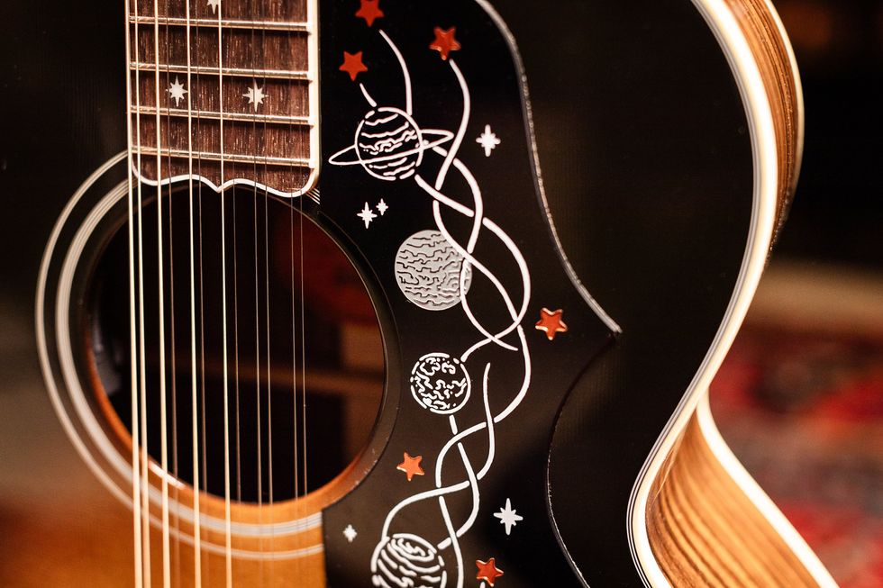 The cosmic inlays on the Brian May SJ-200 represent the rock legend’s work in the field of astrophysics, in which he holds a PhD.