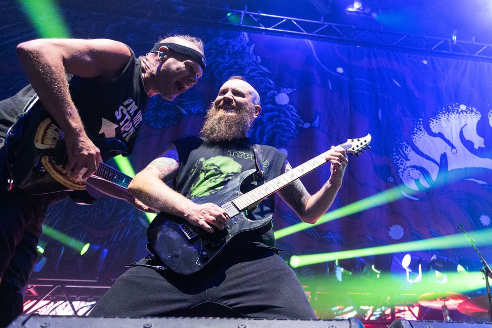 Dutkiewicz says that what listeners end up hearing, tone-wise, is ultimately up to whoever mixes the album, which, in the case of This Consequence, was Mark Lewis at MRL Studios in Nashville, Tennessee. Aside from that, everything else is very cut-and-dried. Stroetzel says there’s always a Maxon OD808 on everything they do that’s dirty. “Throw a little bit of that boost in there, and it just kind of compresses the tone a little bit and brings out the midrange a little more,” he explains. “And then, all we really need is a noise gate. That’s it.” They both play Caparison signature model guitars, incorporating elements of other instruments they’ve played over the years. “I’ve always liked Fender-style guitars—Strats and Teles,” says Stroetzel. “So, my signature model is constructed with those in mind, but to sound a little bit thicker and have some thunder in the low end, like a hot-rod metal guitar.” Dutkiewicz says his guitar was designed with simplicity in mind. “I was ruining guitars on tour,” he admits. “I had a bolt-on once, and my sweat got into the bolt holes and it actually rotted out. I couldn’t believe it. Sweat was getting in the cavity of the guitar, and it was cutting out the pickups and causing corrosion on the electronics inside. So, I got rid of the neck pickup and made it a neck-through. I’m a mangler, so it’s loud, bright, and obnoxious, just like me [laughter].”