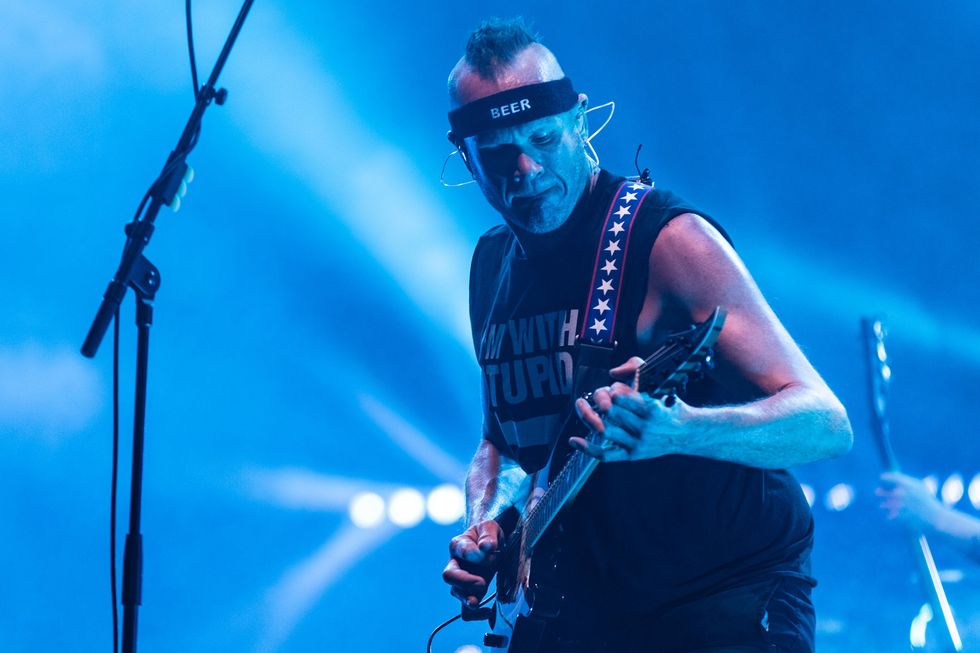 Adam Dutkiewicz, telegraphing his love of suds, onstage at Los Angeles’ Wiltern Theatre in February 2022, playing his Caparison TAT Special FX “Metal Machine” with Fishman Fluence Signature Series Killswitch Engage Pickups.