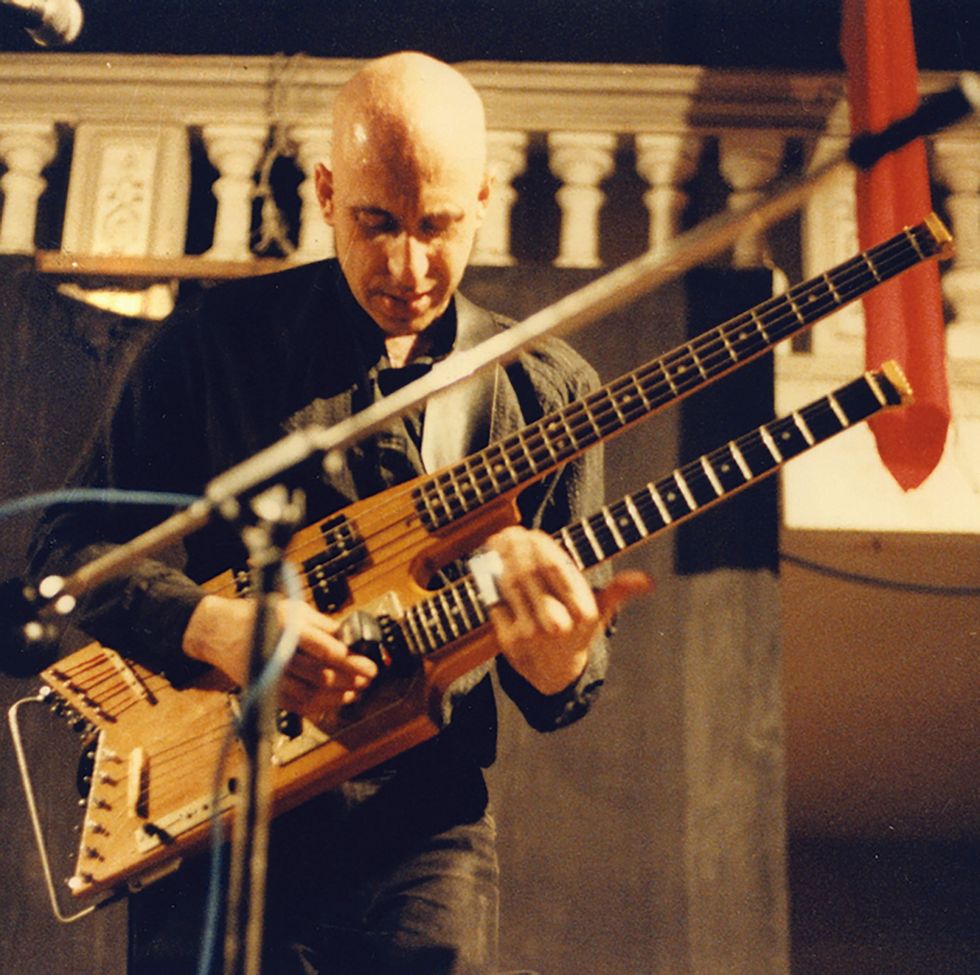 Sharp plays what passes for a fairly staid instrument in his collection: a bass and guitar doubleneck, in 1992.