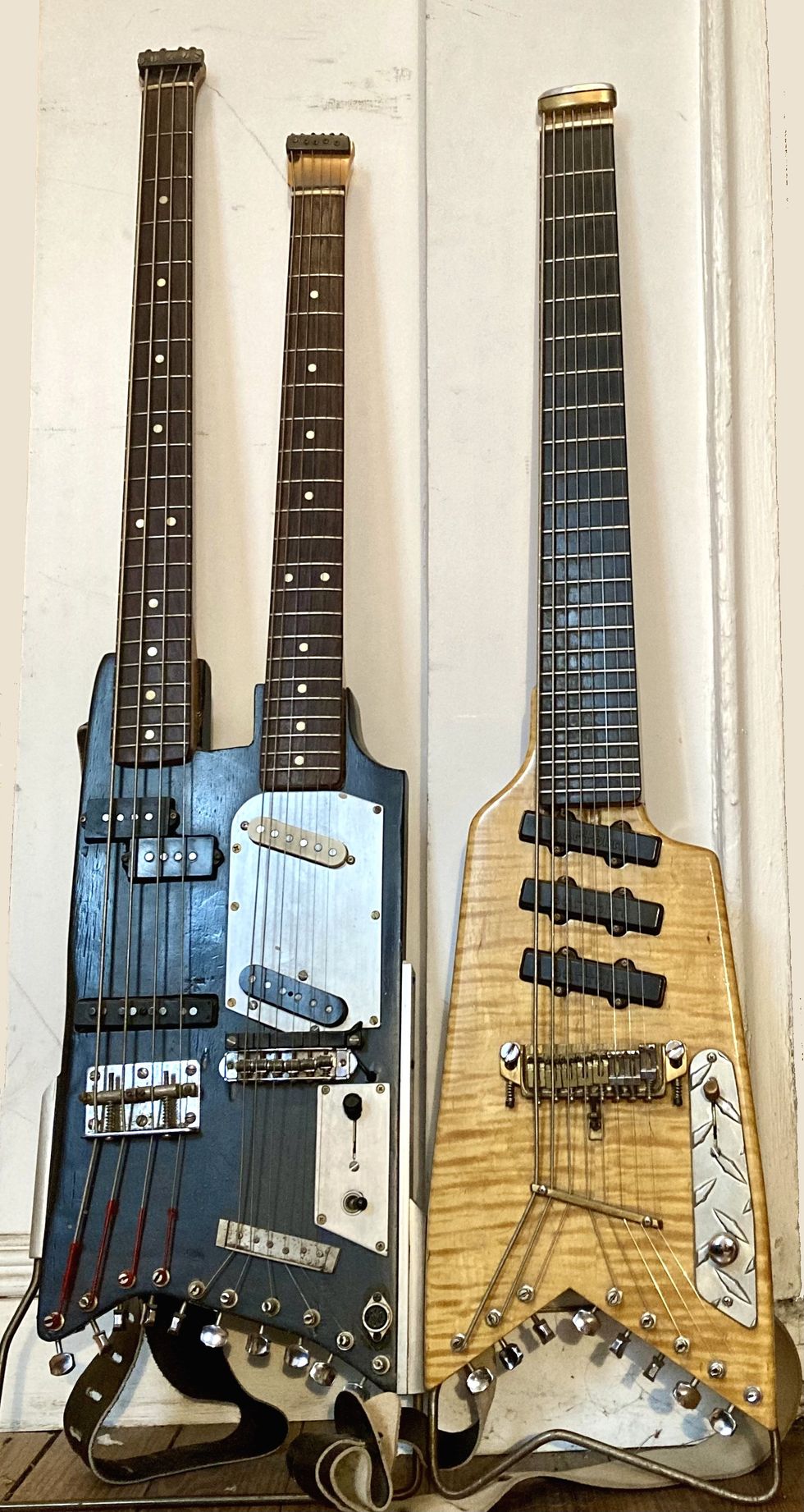When he’s not composing, scoring films, recording other artists, or gigging with the bands he has been in or led for the last several decades (Mofungo, Carbon/Orchestra Carbon, SysOrk, Terraplane, The Bootstrappers, Aggragat), Elliott tinkers with guitars, pedals, mandolins. Elliott is, to me, the king of guitar transformation, and his tinkering is stunningly Frankensteinian as he guts, rebuilds, and alters all kinds of stringed instruments, both electric and acoustic. He recently told me that in the ’60s he built fuzz boxes out of tobacco tins to make money. How cool would it be to have one of those now?? If one does a search on Elliott Sharp, many photos will reveal what I'm talking about: the handcrafted doubleneck he was most often seen playing in the ’80s (there was maybe more than one), 8-string guitars, modified Strat-type guitars with completely different pickups.. He also has a fancy guitar or two, such as his Koll fanned-fret 8-string, upon which he has played many a solo recital. During Covid time,, things were a little slow in the cash-flow department and, as a family man with twins, a little extra income was needed. So Elliott started building really cool-looking guitars out of cheap