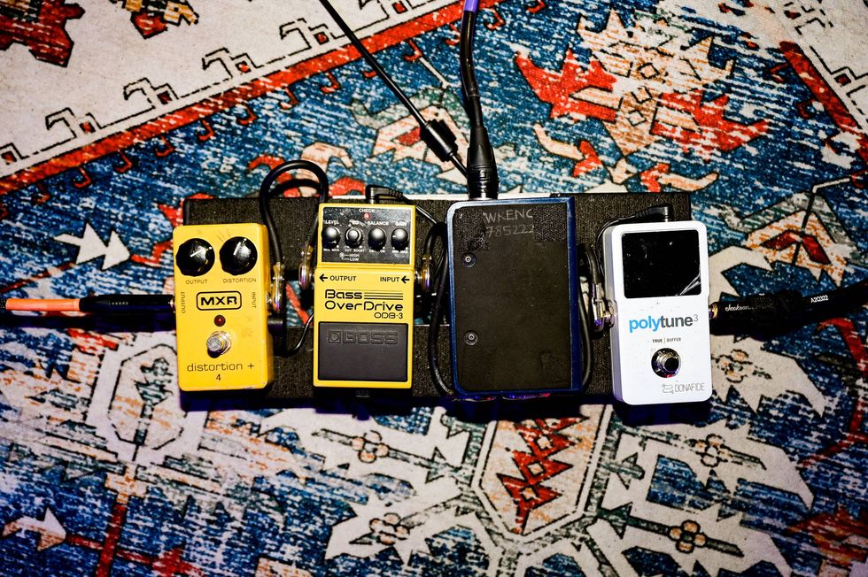 Metzger’s take on the tradition is less virtuosic gunslinger than most of those maestros, instead favoring a more complementary approach with an ear toward supporting the group. To that end, he keeps his sound mostly on the cleaner end by reserving a load of potential sonic energy. “I crank the amp,” he says, pointing out he prefers to set his combo—either a Victoria 35210, a 2x10 Fender tweed Super copy, for LaMP, or a Headstrong Verbrovibe 1x15, a replica of a 1963 Fender Vibroverb, which he favors for JRAD—to 7 or 8 so it’s fully opened up. A self-described “minimalist pedal guy,” he keeps four punch-packing pedals—a Bearfoot Putting Green compressor, Benson Germanium Fuzz, Paul Cochrane Timmy, and an Interstellar Audio Machines Octonaut Hyperdrive—on at all times. As hairy as that may suggest, Metzger maintains clarity, he explains, by keeping his guitar volume set between just two and four. That means that when he wants, he’s just a crank of the volume knob away from a wide-open, full-throated sound.