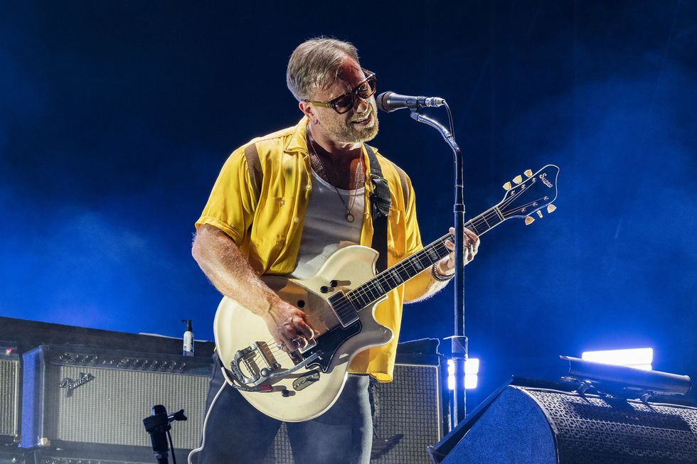 Dan Auerbach plays one of his original Supros in concert in 2023. He has a collection of vintage guitars, including instruments owned by Hound Dog Taylor and Mississippi Fred McDowell.