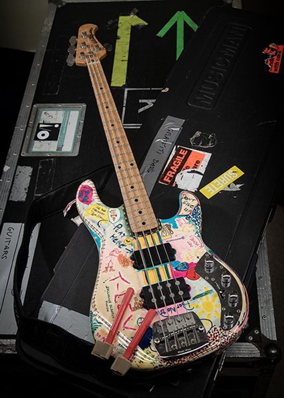 Another of Tony’s favorite instruments is his Graffiti Bass, shown here with its road case and a pair of his Funk Fingers—an invention suggested by Peter Gabriel that he brought to life with the help of tech Andy Moore.