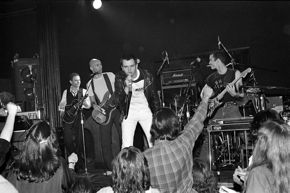 Peter Gabriel and his band live at the Bottom Line in New York City on October 4, 1978. At left: Robert Fripp and Tony Levin.