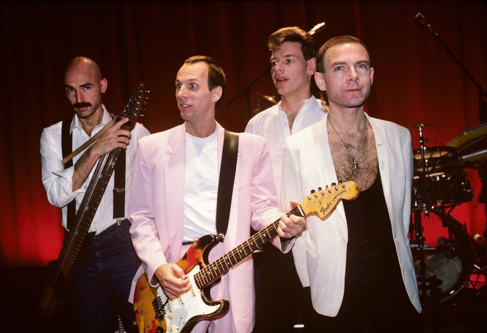 This photo was taken before the historic 1981 line-up of King Crimson went onstage at the Savoy in New York City on November 7 of that year. From left to right, that’s Tony Levin, Adrian Belew, Bill Bruford, and Robert Fripp.