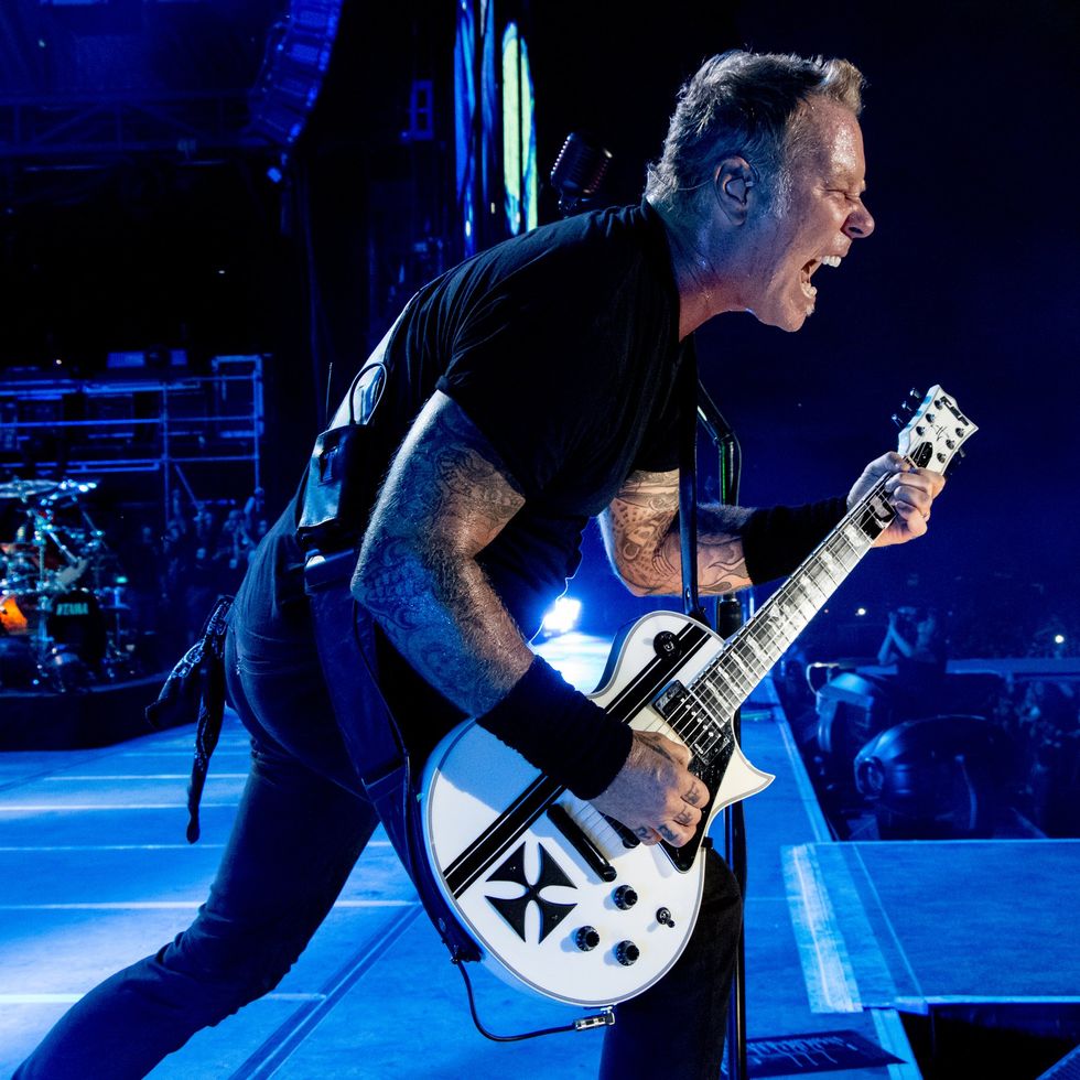 James Hetfield snarls for the camera while extracting huge tone from his EMG Het set.