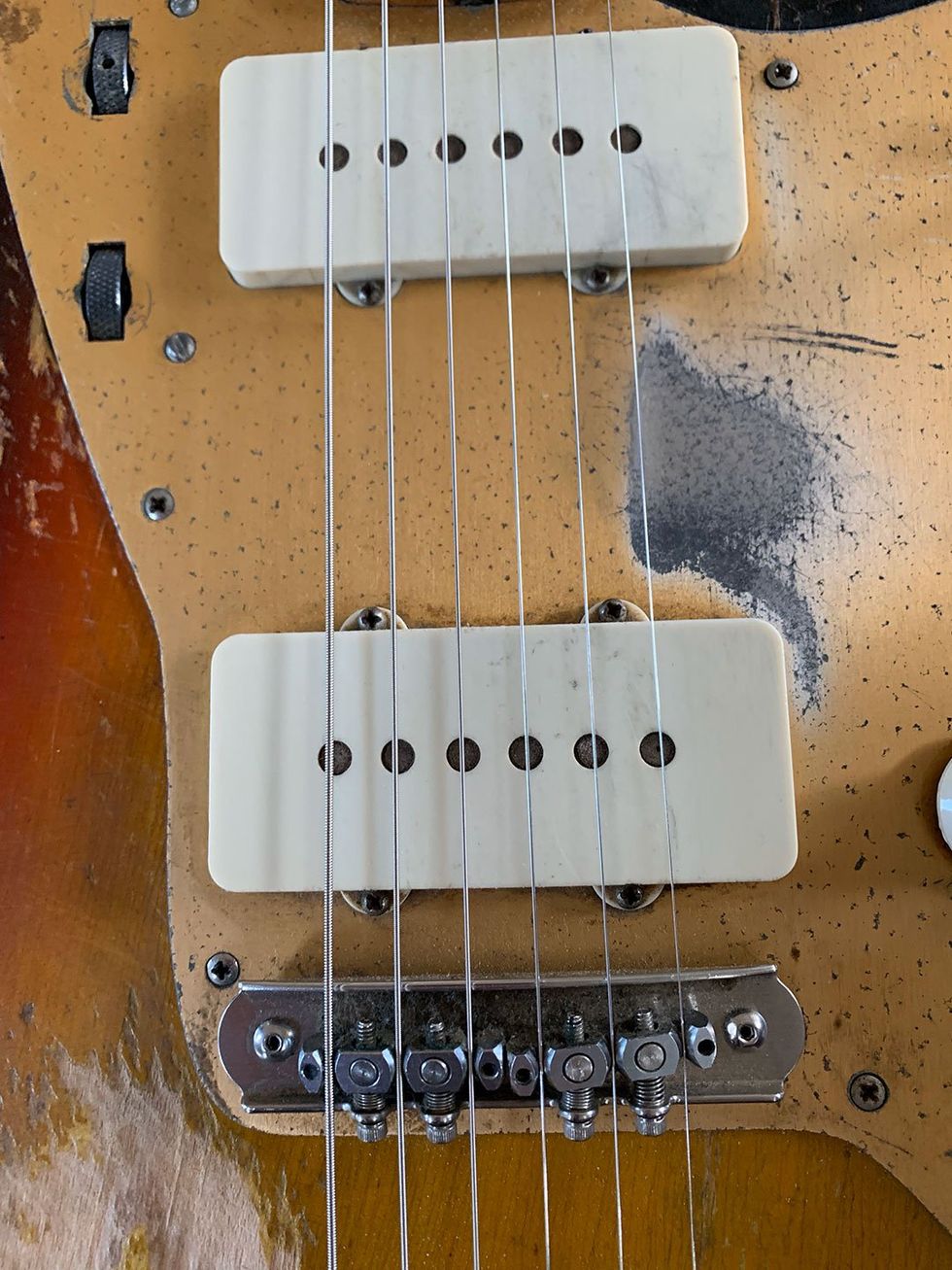 Up close and personal: a look at the pickups in one of Cline’s prized vintage Fender Jazzmasters.