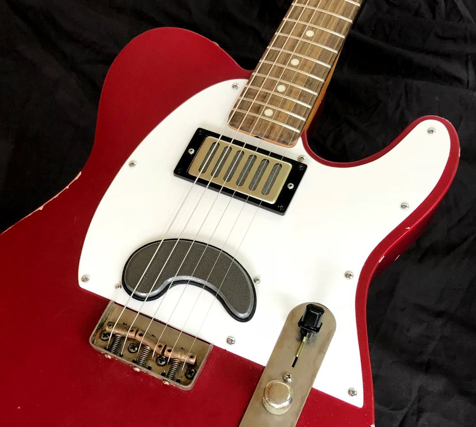 Even Mills’ drop-in pickups tend to look fairly distinct, but his more custom designs, like his curved-coil pickup, are downright baroque. Because his designs don’t rely on typical pickup construction, there aren’t the usual visual cues, like screws popping out of a humbucker cover, or pole pieces on a single-coil pickup. (Mills does preserve a whiff of these ideals with “portholes” on his pickup covers that reveal that pickup below.) Currently, he’s excited by the abalone-shell finish inserts he’s loading on top of his ZUZUbuckers, which peek through the aforementioned portholes.