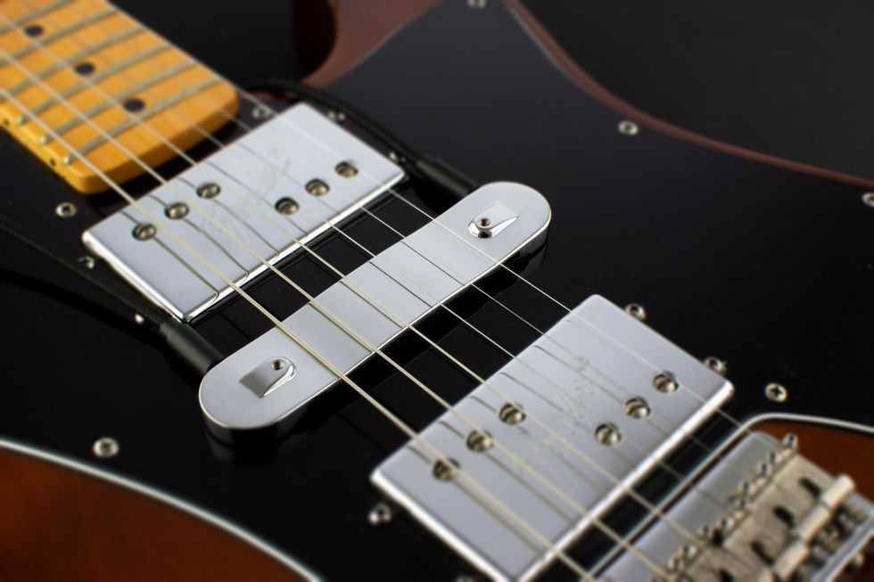 Mills wanted something that split the difference between a humbucker’s fullness and the Strat’s plucky verve, all in clean contexts. But he didn’t want an active pickup; he wanted a passive, drop-in solution to maximize appeal. To achieve the end tone, Mills wired his bobbins in parallel to create “interposed signal processing,” a key piece of his patented design. “I found that when I [signal processed] both of them, I got too much of one particular quality, and I wanted that dimensionality that comes with two qualities simultaneously, so that was essential,” explains Mills.