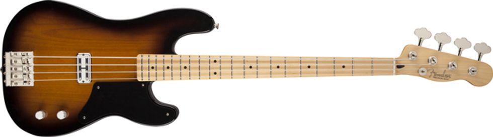 The Cabronita Precision Bass guitar takes Fender’s revolutionary first bass and decks it out in distinctive and powerful Cabronita style. Features include an alder body with forearm contour, “C”-shaped maple neck with gloss urethane finish, 9.5”-radius maple cap fingerboard with 20 medium jumbo frets and black-dot inlays, single Fideli’Tron humbucking bass pickup, single-ply pickguard (black on 2-Color Sunburst model; white on Black and Candy Apple Red models), modern High Mass bridge, knurled chrome control knobs (master volume, master tone) side-mounted output jack and vintage-style reverse tuners.