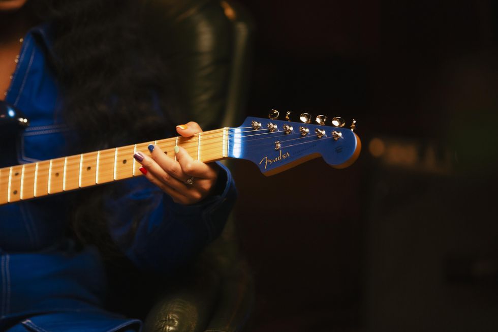"I distinctly remember my father teaching me how to play my first blues scale on a Fender mini black-and-white Stratocaster. Filming this interview with him, reflecting on my musical journey, and the development of my second signature Fender guitar has been a surreal ‘pinch me’ moment. I designed my Limited Edition Stratocaster guitar with a color, shape and sound that is 100% my own so that young women and players from all backgrounds feel inspired to pick up this guitar, tap into their thoughts and create amazing music.” - H.E.R. on the Limited-Edition Strat