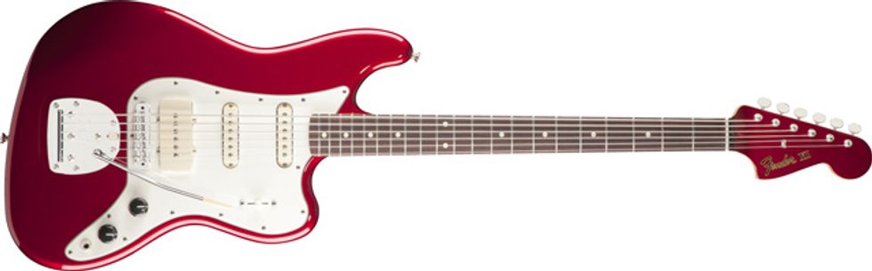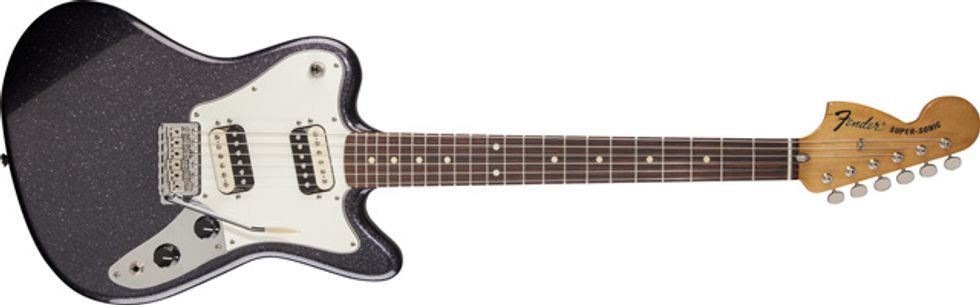 The Pawn Shop Super-Sonic model resurrects an unusual, short-lived and increasingly collectible ancestor of the late 1990s, the Squier Vista Series Super-Sonic guitar. Very little about the Pawn Shop Super-Sonic isn’t highly distinctive—from its diminutive offset "reverse" body (resembling an upside-down Jazzmaster or Jaguar) and upside-down headstock to its short scale (24") and dual canted Atomic humbucking pickups (only the bridge pickup was canted on the original Squier models). Then there are the controls--neck pickup volume and bridge pickup volume only (no tone control), which are reverse-wired like the Squier original, meaning that the bridge pickup volume is the one closest to the bridge and the neck pickup volume is the one farthest from it. Other features include a "C"-shaped maple neck with "bullet"-style truss rod, 9.5"-radius rosewood fingerboard with 22 medium jumbo frets, three-way toggle pickup switching and dual Jazz Bass control knobs, three-ply parchment pickguard, vintage-style synchronized tremolo bridge, vintage-style tuners and new Super-Sonic four-bolt neck plate. Available in Apple Red Flake, Dark Gun Metal Flake and Sunfire Orange Flake.