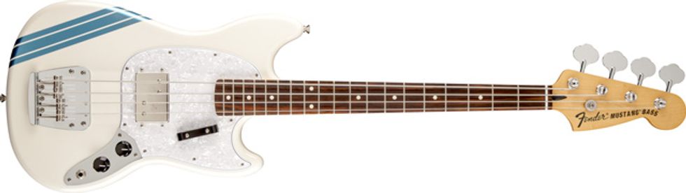 With its racing stripe (305) and short scale (30"), the new Pawn Shop Mustang Bass authentically evokes the original "competition" Mustang Bass of the early 1970s. This time, though, you get the huge bass sound of a single humbucking pickup (the original had a single-coil pickup) and several classic Fender finish options. Other features include an alder body, "C"-shaped maple neck, 9.5"-radius rosewood fingerboard with 19 medium jumbo frets, four-ply white pearloid pickguard, two Jazz Bass control knobs (volume, tone) and a string-through-body bridge with four adjustable saddles. Available in 3-color Sunburst, Candy Apple Red with Olympic White stripe and Olympic White with stripe.