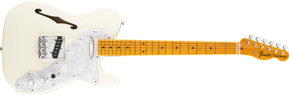 The American Vintage ’69 Telecaster Thinline is equipped with a semi-hollow mahogany body with f hole and gloss lacquer finish; C-shape maple neck with gloss lacquer finish; maple fingerboard; American Vintage Telecaster single-coil neck and bridge pickups with three-position switching, vintage-style three-saddle strings-through-body Telecaster bridge, “top hat” pickup switch tip and vintage-style “F” tuners.