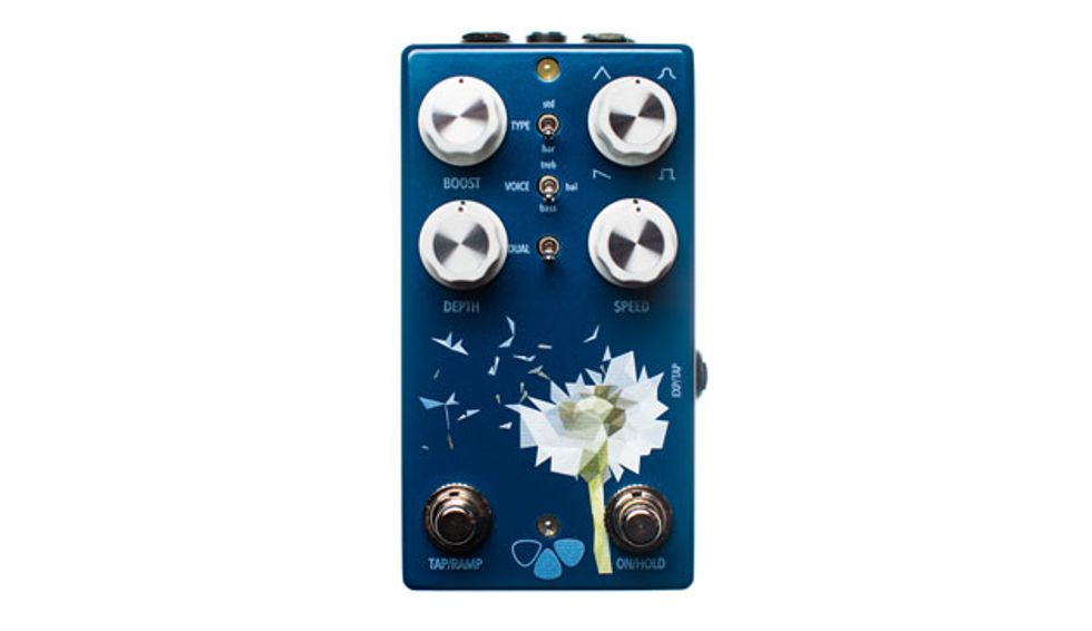 The Dandelion is feature rich in a small package. It features both standard and harmonic tremolo, along with 3 voicings for the harmonic mode. Controls are available for Boost, Depth, Speed, and Shape. An extra footswitch is available for tap tempo as well as ramping.