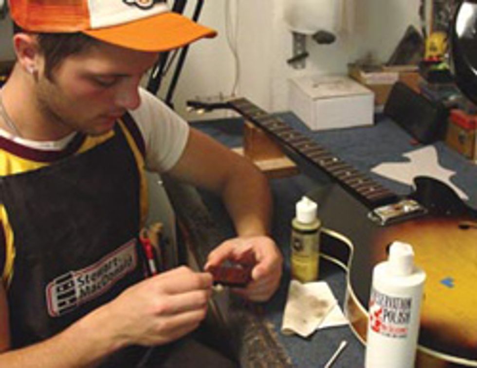 BGF Guitar Elixer (brownsguitarfactory.com) wood restorer is applied to the fingerboard, bridge, and tailpiece. I had my assistant Carson Lulic apply the Elixer to the bridge and tailpiece with a Q-tip. The wood was looking very dry and pale, but after conditioning is soft and lustrous.