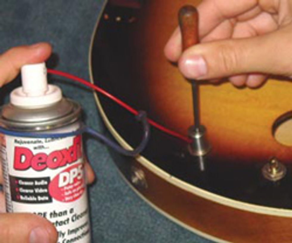 Dirty sounding pots and electronics are detected through plugging into an amp. I clean pots using DeoxIt (StewMac #5027) with the CTS Pot Cleaning Cap (StewMac #0291). The Pot Cleaning Cap is a quick solution for cleaning noisy hard-to-reach control pots without extracting them from a guitar or amp.