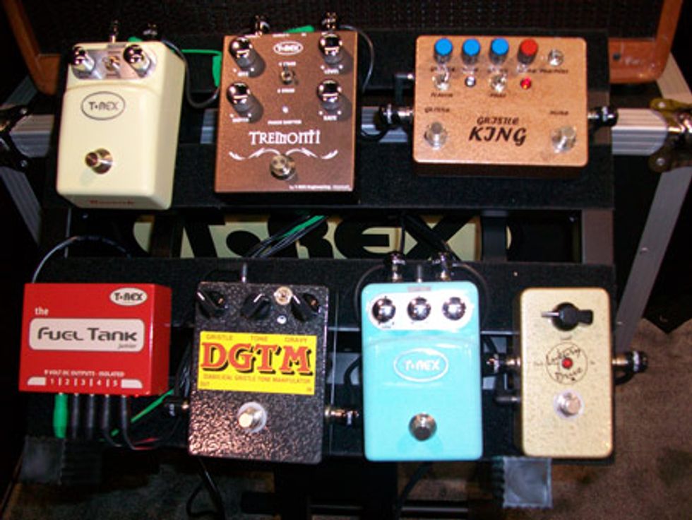 T-Rex's new pedals (l to r, top row): Tonebug Reverb, Tremonti Phaser, Gristle King
