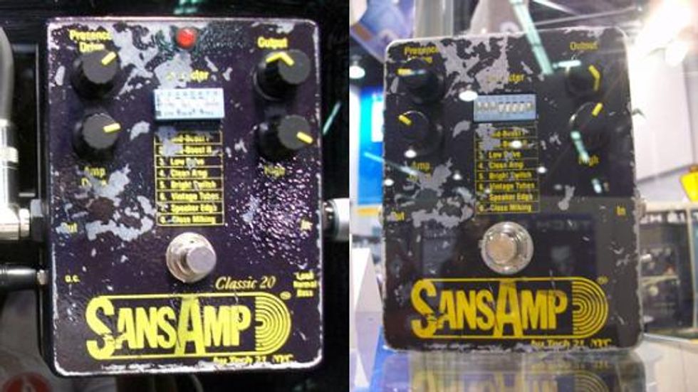 Tech 21's SanAmp Classic 20 (left), celebrating the company's 20th anniversary. The pedal is relic'd to look like the very first SansAmp ever made (right).