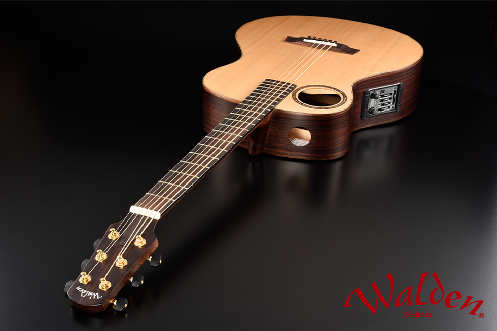 With its offset soundhole, side-port, and solid Sitka spruce top with innovative low-mass bracing, the Walden B1E sounds sonically excellent while incorporating the more comfortable Grand Auditorium body shape. A graphite reinforced Mahogany neck contribute to stability and its 27″ scale length and 1-13/16″ nut width contribute to the B1E Baritone's transparent playability.