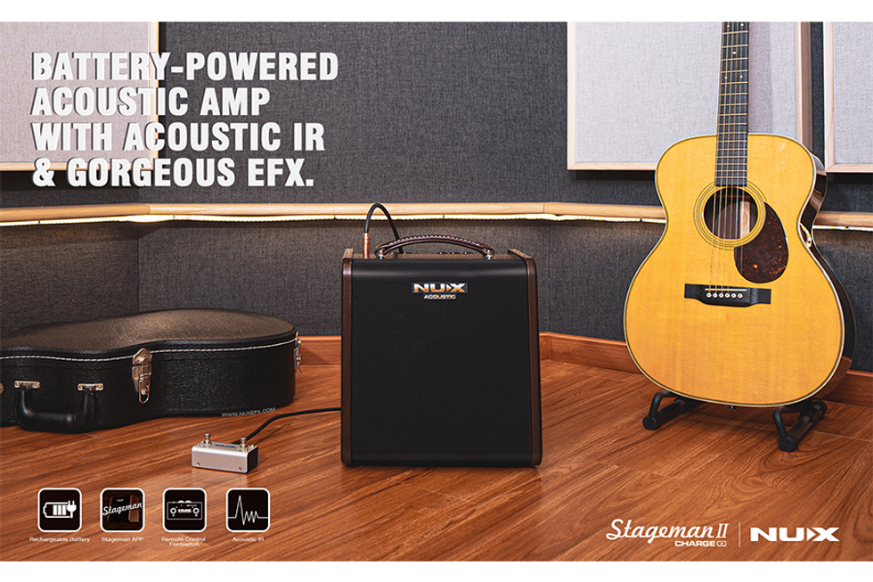NUX Stageman II Battery-Powered Acoustic Guitar Amplifier features a pure analog preamp with NUX's iconic Core-Image post-effects. It has specific EQ scenes for finger-style as well as strum-style in channel 1, and you can engage built-in Acoustic IRs with a dedicated mobile APP. Acoustic IR is the new trend to make your acoustic sound as natural as micing. Stageman II keeps Drum & Loop, you can control by the original NUX NMP-2 foot-controller. And the built-in rechargeable battery can let you busk on the street for 4 hours.