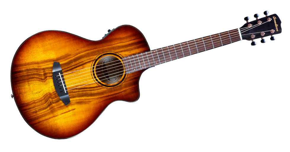 Myrtlewood, while native to Oregon's Pacific coast, might just be the most 'exotic' of all tonewoods, capturing the deep bass of rosewood, the pure warmth of mahogany and the sweet, glassy treble of maple in one exquisite, visually enchanting package—here under an equally captivating tortoise-bound Tiger's Eye gloss finish. This sustainable acoustic-electric Pursuit Exotic S Concertina has all the charm of a vintage short-scale 12-fret parlor guitar, but with a full, punchy modern sound and maximum playing comfort. A fast, slim neck and soft cutaway access to every fret let your fingers, and your heart, have their say. Sound better than ever with Breedlove's earth-conscious, sonically superior EcoTonewood technology. Get fierce with a Tiger's Eye!