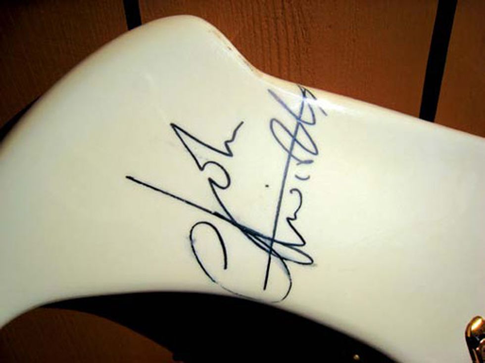 Buzzards for John in subsequent years.The Buzzard featured here has its own story to tell. Warwick made about 18 basses specifically for Entwistle in 1990, and the bass shown here was the only instrument out of Entwistle’s extensive collection chosen to be featured on the cover of his book Bass Culture. It features a 34" scale and two EMG P-style pickups. On the Buzzards built for Entwistle, he preferred a Modulus graphite neck for its ability to hold his low-action, which required constant truss-rod adjustments on standard necks. He also valued the neck’s suitability for his dynamic playing, as well as its seeming imperviousness to weather changes.