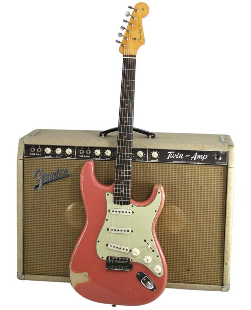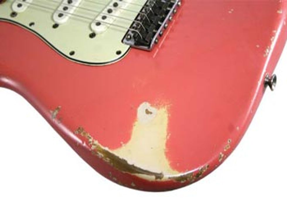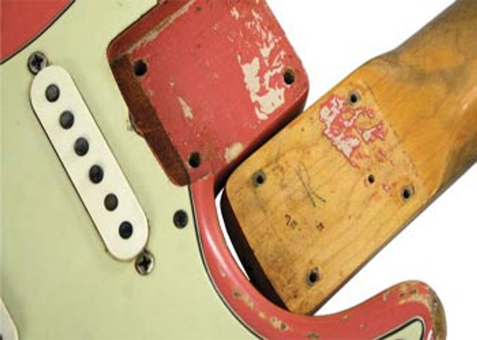 Besides having all the classic characteristics that make early ‘60s Strats appealing to players and collectors, this one has an ultra-rare color. According to an old piece of masking tape attached under the pickguard, the color is Tahitian Coral (a color of the same name was used by Chrysler in the late ‘50s). This non-standard color was not mentioned in any Fender catalogs (the closest official Fender color at the time was Shell Pink, listed from 1960–1963). An undercoat of Desert Sand can be seen where the top color has worn off. Proof that this color is factory original can be seen after unscrewing the neck. An area of paint from the body has stuck to the neck leaving a bare spot in the neck pocket that is an exact match to the glob stuck to the neck.