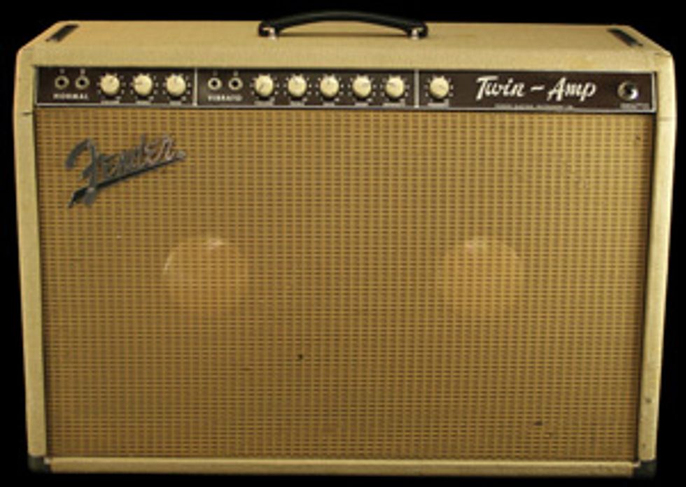 By 1961, the white Tolex Twin was released. It shared the color scheme of the new “piggyback” series (amp heads paired with separate matching cabinets). This Twin had four 5881 power tubes putting out 80 watts like the ’50s version, but added the vibrato channel used by most Fender amps at the time. The amp’s grille cloth had a dark maroon color from ’61 to ’62, and a wheat color from ’62 to ’63. Blonde Tolex Twins like the one shown here were discontinued in 1963, when the black Tolex Twin Reverb became the most ubiquitous combo amp of all time. (Also pictured this month are a 1965 Olympic White Fender Jaguar and a 1964 Fender Reverb unit.)