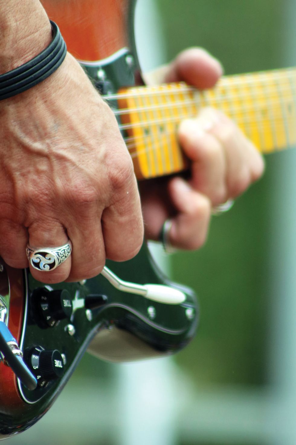 The hands that have been inside of countless amps have also been on the necks of many, many guitars. Here, Jeff Bober lays into a favorite Strat. Photo by Robert Jordan