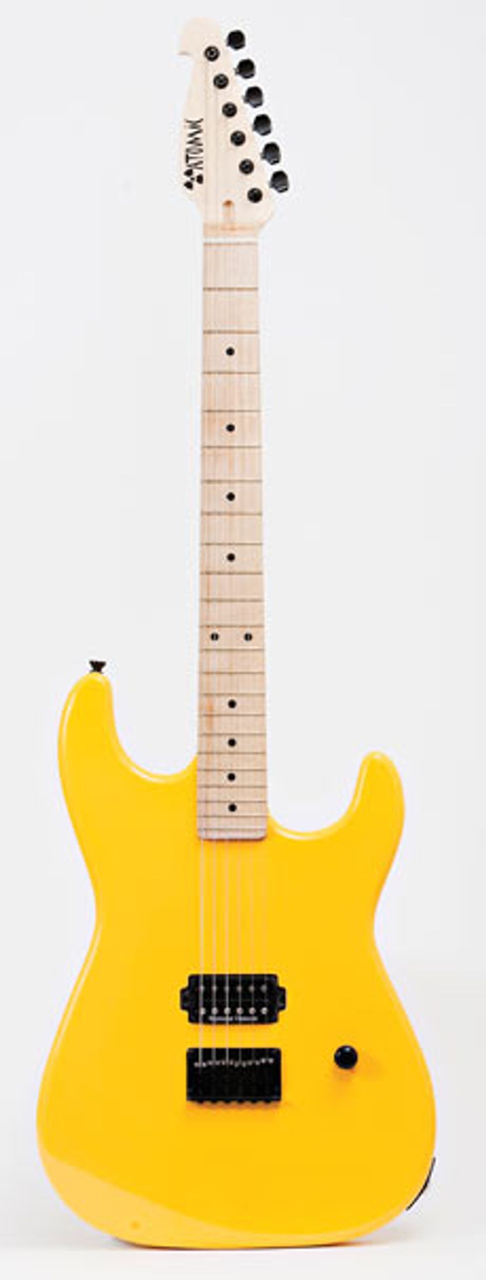 The STD1 is Atomic’s baseline model: a basswood Strat-style body and a bolt-on maple neck and fingerboard with a 25.5” scale length. The simple design houses a single Seymour Duncan JB humbucker and comes standard with a Gotoh hardtail bridge and Hipshot tuners. The model reviewed came in a blindingly bright canary yellow urethane finish with all black hardware, and it may very well be the lightest guitar I’ve ever played. It also shares a standard feature with all Atomic guitars, the Atomic Direct Mount Pickup System, which bolts the pickup right to the body using a clever mounting system that really increases both sustain and harmonic resonance. The appointments are simple and to the point, and everything is built by hand (no CNC) by Tim Mulqueeny and Harry Howard in their two-man, Peoria, AZ shop, just outside Phoenix.