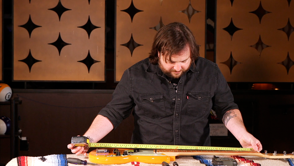 Make sure your neck has the appropriate amount of relief. You can either use a straight edge along the tops of the frets, or hold a string down at the first fret and at the fret that meets the body, measure relief around the 7th to 10th fret area. You’ll want to see at least a very small gap between the strings and the frets here—I suggest not much more than a business card’s thickness to start with.