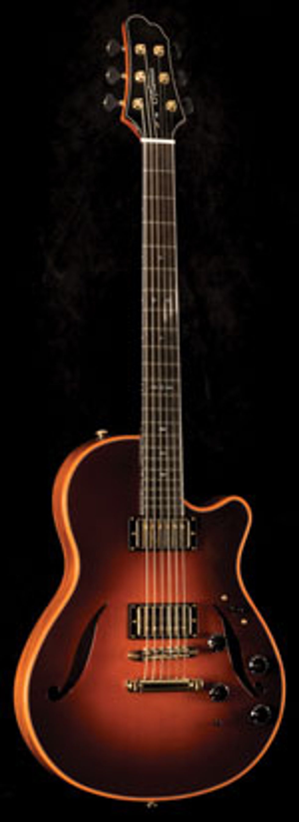 Likewise, the Fralin Unbuckers are a fine choice for its electric voice, as their uneven coil winds augment the split coil modes, which blend very nicely with the Ghost system. The 5-way switch is as follows: pos. 5, neck humbucker (8.0K); pos. 4, neck split (4.5K); pos. 3, neck and bridge humbuckers (8.0K, 9.2K); pos. 2, neck and bridge split (4.5K, 5.2K); and pos. 1, bridge humbucker (9.2K). The electric mode offers up useable tones that range from jazz to blues to classic rock. While the guitar did not feed back at high volumes, high-gain applications left me wanting a little extra cut, which is typical of most semi-hollow designs. I found the blended tones quite appealing; as the electric tones became livelier their frequency range was extended by adding the Ghost system to the mix.