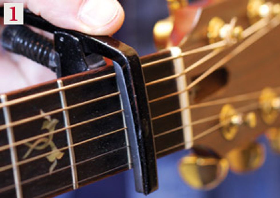 2. Clamp a capo on top of (not behind) the 1st fret (Photo 1). By doing this, you create a “zero” fret and temporarily remove the nut from the action equation. This allows you to initially focus on saddle height and neck relief.