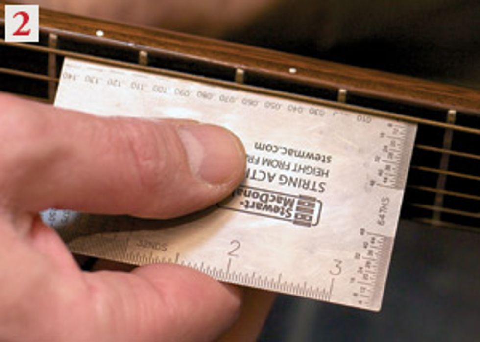 2. Measure the greatest distance between the bottom of the string and the top of the frets (Photo 2). The largest gap typically occurs somewhere between the 7th and 9th frets—essentially in the middle of the neck.