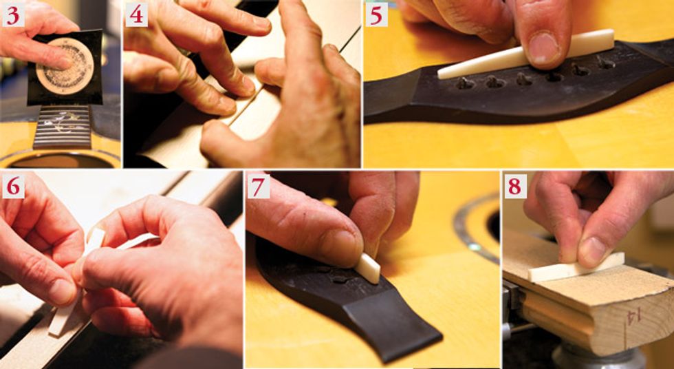 Using 80- and 400-grit sandpaper adhered to a flat surface, sand the thickness of the new saddle so it fits snugly into the saddle slot (Photo 4). Sand off just enough thickness that you don’t have to force the saddle in, but keep the fit snug enough that the saddle doesn’t rock inside the slot. Check your progress by trying to insert the new saddle into the slot (Photo 5).