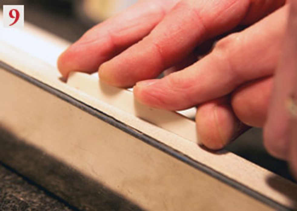 6. Once the blank fits correctly into the saddle slot, use a radius block equipped with 80-grit selfadhesive sandpaper to sand the top of the saddle down to the line you traced onto the blank (Photo 8). This operation sets the basic saddle height while making sure the saddle follows the fretboard curve. Matching this radius ensures that the string height will be consistent across the fretboard. If you don’t do this, you may end up with some strings too low and others too high, making the guitar difficult to play.