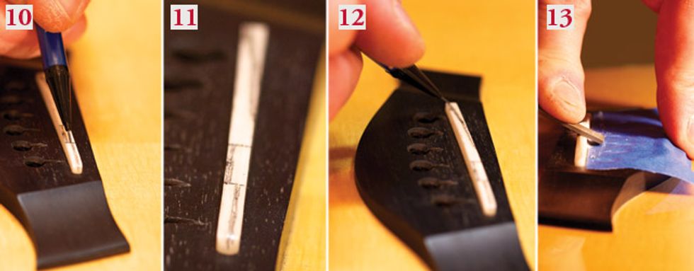Remember, the G string’s contact point is at the front edge of the saddle; from this point, the saddle will slope back down toward the G’s pin hole. The low E will only make contact at the rear of the saddle—1/32" from its edge. The A and D strings fall in line between the low E and G (Photo 13). Once you’ve removed the appropriate material from the rear of the saddle for these strings, file off any excess material from the front side of their contact points. Giving the strings a clean leading edge allows them to vibrate freely.Tip: Each string will rise from the pin hole to the saddle at a different angle. You can easily determine this angle by turning your file on its narrow edge and laying it between the pin hole and the saddle (Photo 14).