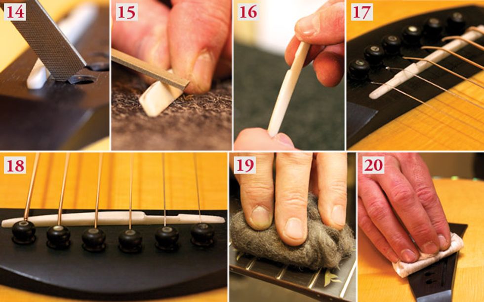 9. Remove the saddle and polish it with 600-grit sandpaper and a cloth. While you’re at it, clean the fretboard with ultrafine #0000 steel wool (safe for fretboards, but don’t let it touch the finish) and then treat the fretboard and bridge with lemon oil or a lubricant like Planet Wave’s Hydrate (Photos 19 and 20). Reinstall the saddle, string up, tune to concert pitch, and you’re good to go.