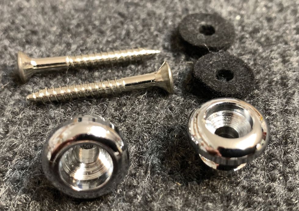 The original strap buttons have a slightly different shape, and the early models were made out of aluminum, while the ones on the Harley Benton are metal. You can buy aluminum strap buttons with the original shape from several companies if you wish: the Gibson part number is PREP-020. Personally, I'm fine with the ones on the Harley Benton guitar, but I removed the black felt washers underneath them. Vintage guitars don't have these, and because we'll relic the body of the guitar as well, there's no need to protect the finish in these areas.