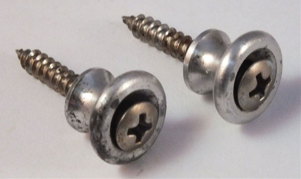 You can use the same relic'ing process we used for the metal parts of the tuners and screws in my previous column, “DIY: Relic'ing Tuners, Part 1," but I'll also show you an alternative way to do this. If you want to keep the stock bridge or change it for a similar type with individual adjustable saddles, it's important to completely disassemble the bridge before you start. At first, have a look at the pics of the original bridge and strap buttons, to get an impression of how they look after 50 years and more. Especially on the vintage bridge (Image 3), you can see there is noticeable wear-off where the strings have contact and that everything looks a bit dull. So, as always, break the shine with fine sandpaper or steel wool. If you want to mimic heavy wear-off on the bridge, use a small file or some sandpaper wound around a toothpick or similar, and rub away the nickel plating at the contact points of the strings. Next, put everything inside our box with the mixture of nails, metal parts, broken glass, gravel, sand, little stones, basalt, etc. and shake the devil out of it to create some nice random scratches, dings, dongs, and bumps. When you're happy with the result, take the parts out of the box and use a soft brush to clean them from dust. If you want, you can use iron (III) oxide (ferric oxide) liquid to create even more patina on some random spots of the hardware and the screws. Don't forget to wear gloves and goggles and to use old newspapers to protect the surface you're working on.