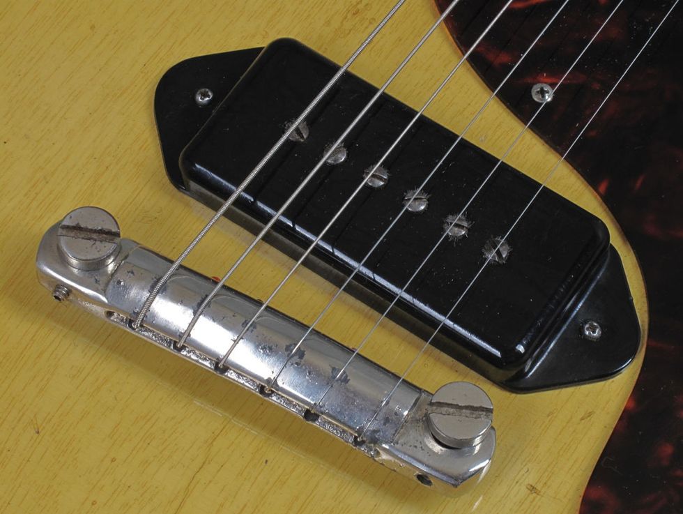 As for the bridge, we have a big difference here. The vintage Gibson has the classic, super-simple, and non-adjustable wraparound-bridge design (Image 3), while the Harley Benton has a wraparound version with six individual adjustable saddles, like a Stratocaster (Image 4).