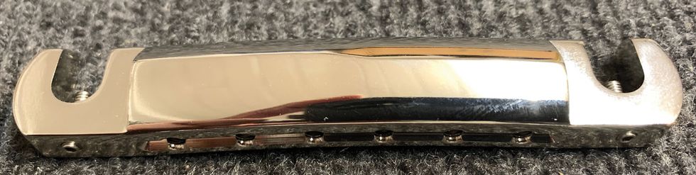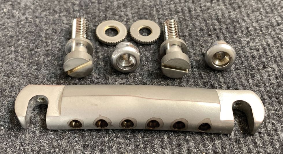 I decided to change the bridge for a compensated, non-adjustable wraparound bridge made out of solid aluminum from the KMS company called the “Whiptail" (Image 5). This looks pretty much like the original but is compensated for a better intonation and is a real upgrade regarding tone.