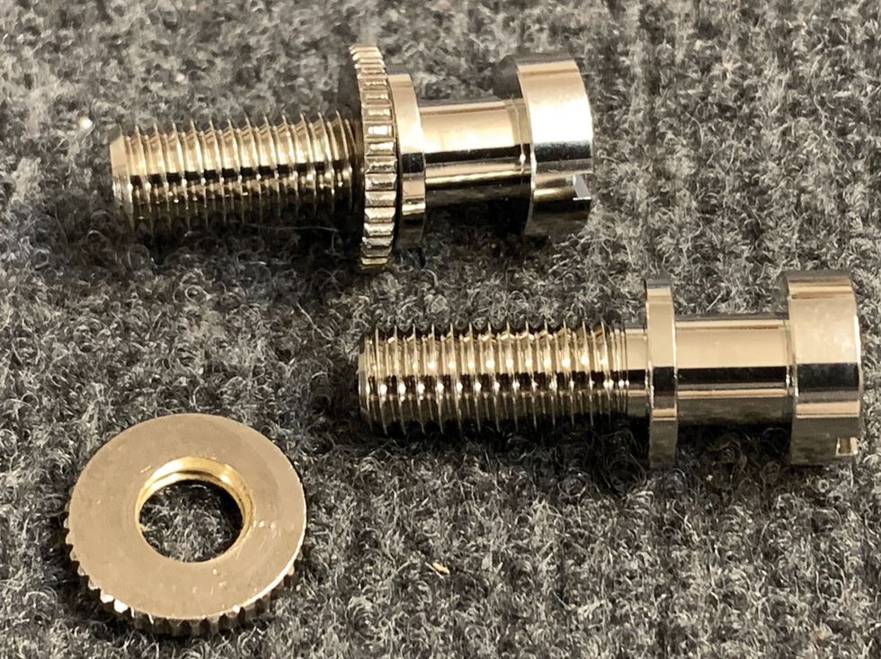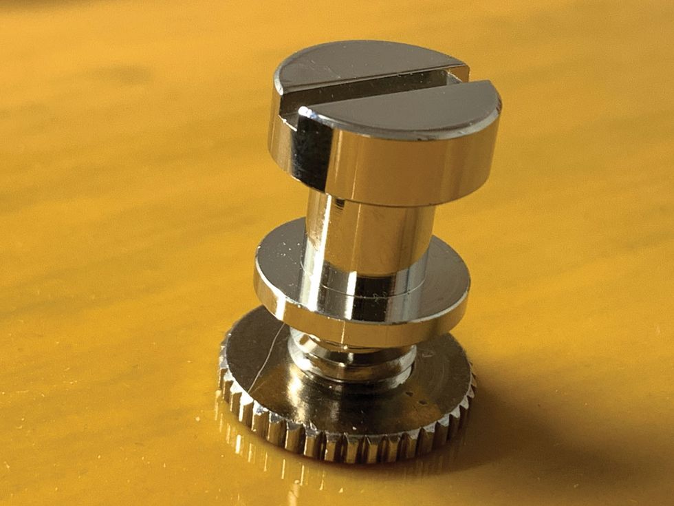 I also changed the diecast studs for the KMS version made out of steel (Image 6) and incorporated another upgrade: an additional thumbwheel to lock the studs against the bushings. I do this on almost all Gibson-style bridges to enhance tone and stability. The problem is, there are no existing thumbwheels with a M8 thread, so I had to use a standard thumbwheel and modify it to fit. The system behind this is very easy: Simply put the thumbwheel on the studs as high as possible and screw the studs into the bushings before installing the bridge. After adjusting the perfect height of the studs, get the thumbwheel as low as possible and tighten it so it will lock the studs against the top of the bushings (Image 7). Voila! The whole bridge system is as solid as can be now, and you'll instantly recognize how tone and sustain is enhanced on most guitars, so give it a try. I left the original bushings in place to avoid any possible damage on the lacquer when pulling them out to replace them. The factory-equipped ones are okay and will work fine.